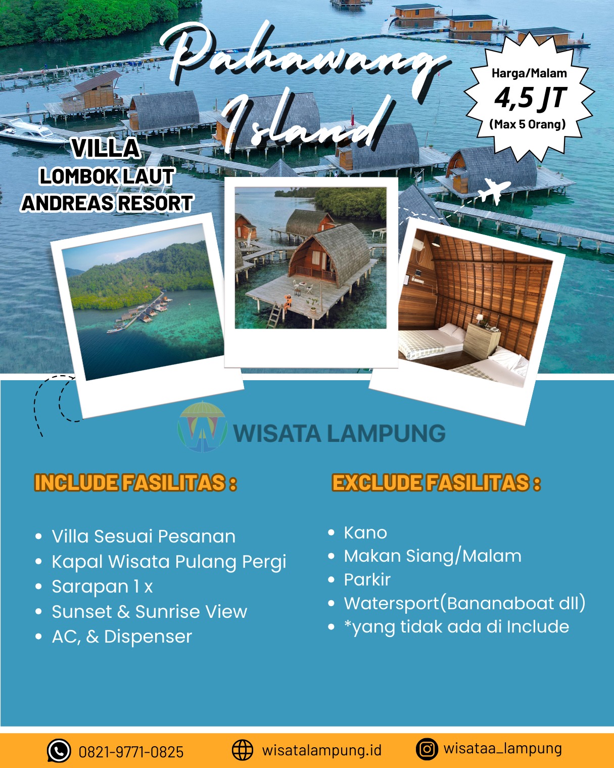 Villa Andreas Resort Pahawang tipe Villa Lombok Laut adalah tempat istimewa di mana pesona alam Pahawang bertemu dengan kemewahan penginapan. Terletak di tepi laut dengan pemandangan yang menakjubkan, villa ini adalah tempat ideal untuk melarikan diri dari hiruk-pikuk kota dan terhubung kembali dengan alam. Dengan desain yang khas dan nuansa tradisional Lombok yang terasa kuat, setiap sudut villa ini memancarkan kehangatan dan ketenangan. Dilengkapi dengan fasilitas modern, Anda akan merasakan kenyamanan tanpa batas sambil tetap merasakan keselarasan dengan alam sekitar. Dengan layanan yang ramah dan pelayanan yang sangat baik, Villa Andreas Resort Pahawang tipe Villa Lombok Laut adalah destinasi sempurna bagi mereka yang mencari pengalaman liburan yang tak terlupakan di Pahawang.