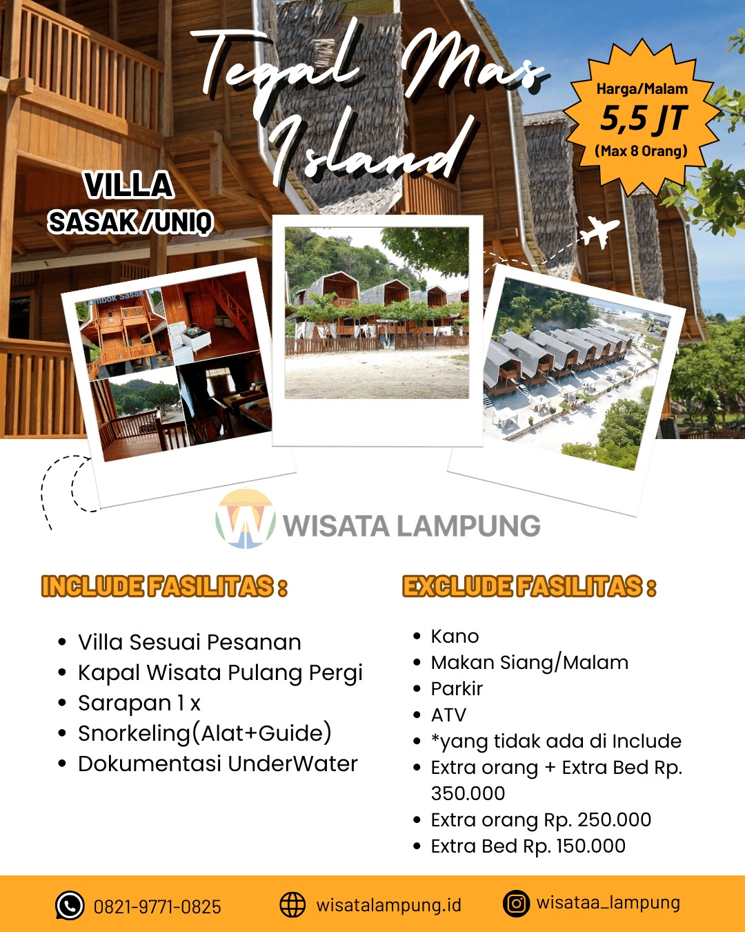 Di Villa Sasaq, Anda akan menemukan tempat yang sempurna untuk bersantai dan menghilangkan stres sejenak. Dikelilingi oleh keindahan alam tropis, setiap vila kami dirancang dengan gaya yang memikat dan fasilitas yang memanjakan. Tidak hanya itu, Unik Pulau Tegal Mas juga menawarkan pengalaman menginap yang tak terlupakan dengan pemandangan laut yang menakjubkan dan suasana yang tenang. Jangan lewatkan kesempatan untuk menikmati aktivitas menyelam, snorkeling, atau hanya bersantai di tepi pantai pasir putih. Segera rencanakan liburan Anda bersama kami dan rasakan keajaiban pulau yang mengagumkan di Villa Sasaq dan Unik Pulau Tegal Mas Lampung.